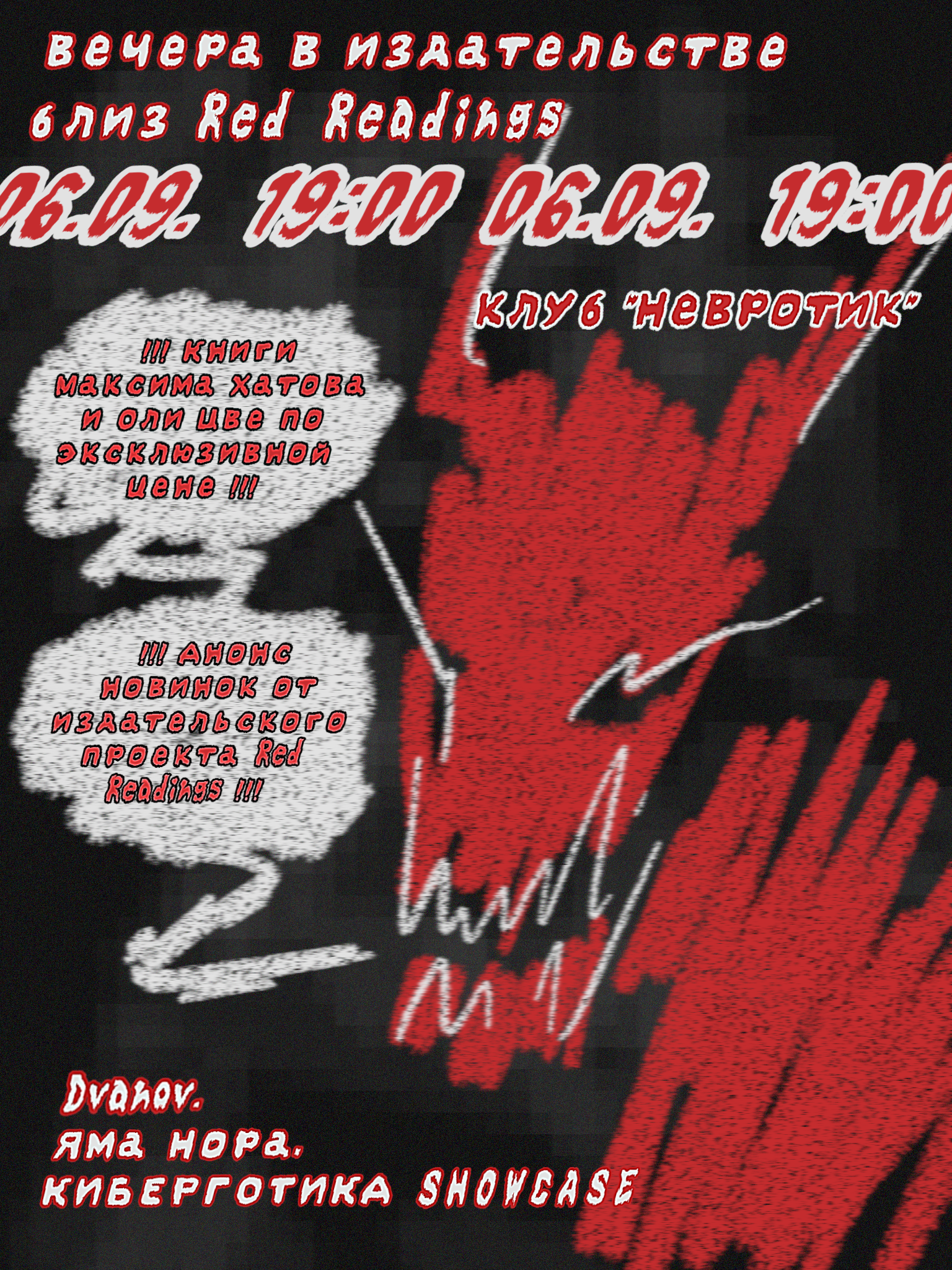# Шоукейс поэтического рейв-фестиваля «Киберготика»: стихи Кати Вахрамеевой, Арины Воронцовой, Марины Иванковой, Кати Камушкиной, Михаила Постникова, Ксении Пройдисвет, Максима Хатова, Оли Цве, Давида Чанидзе в саунд-дизайне TEENRAVE, Мистера Свэга и кладбища блеска